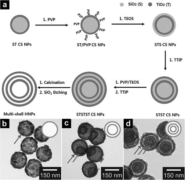 多壳层空心结构类似于俄罗斯套娃,他们有多个不同尺寸同心或偏心壳。因为它们复杂的中空结构,其合成和操作比单壳层结构更具挑战性。一般越复杂的目标结构,其合成过程也越复杂。因此,一些不同于常规方法的特殊合成策略常被用来合成多壳层空心结构,此节将对多壳层空心结构的合成方法做一个综合评述。