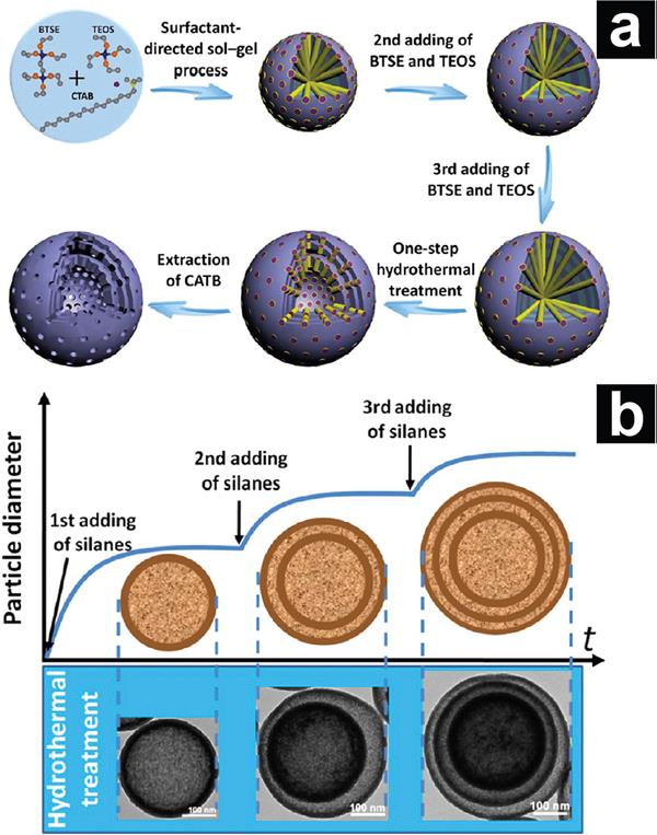 在空心结构的制备过程中,蚀刻已被广泛用于去除模板和牺牲层。模板和牺牲层组成通常与所需材料不同。最近一些空心结构的合成可通过选择性蚀刻单组分材料的方法制备,例如SiO2,普鲁士蓝(PB)、ZnSn(OH)6和CoSn(OH)6等。这些母体材料的共同特征是他们都有一些“软区域”和“硬区域”,而后可以选择性地移除“软区域”,保存“硬区域”进而可形成中空结构。如在十六烷基三甲基溴化铵 (CTAB) 为软模板,1,2-双(三乙氧基硅基)乙烷 (BTSE) 和正硅酸乙酯 (TEOS) 为前驱体合成介孔乙烷桥联有机硅微球时,BTSE和TEOS的重复添加生成了多层有机硅/ CTAB复合微球,早期反应阶段在有机层的内部区域形成低缩合度的“软区域”,后期则在每个层的外部区域形成了高缩合程度的“硬区域”,有机硅/ CTAB复合微球在经受热处理时,“软区域”受水的影响而溶解,“硬区域”则不受影响而形成多重空心壳。