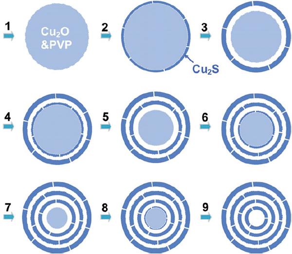 奥斯特瓦尔德熟化 (Ostwald Ripening) 是一个众所周知的晶体生长现象,它指的是“小晶体或溶胶粒子溶解后其溶解物在较大晶体或溶胶粒子的表面再沉积”的现象。在成核和晶体生长的早期形成的内部微晶相对较小,具有较高的表面能,而那些成形于后期在外表面的晶体比较大。因此,球体的中心区域开始通过溶解疏散,结果产生空心腔,从而形成空心结构。利用这种现象,人们利用种子介导生长采用连续的奥斯特瓦尔德熟化法合成了Cu2O(@Cu2O)n多重壳结构。第一次熟化时新生成的Cu2O沉积在Cu2O晶体种子的表面,形成一层较厚的外壳,第二次熟化时贴近第一壳体新形成的尺寸相对较小的晶粒疏散溶解,而位于最外层的较大的晶粒保留下来,然后重复沉积熟化,即可获得多重壳空心结构。