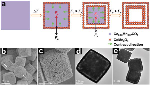 物质迁移在奥斯特瓦尔德熟化 (Ostwald Ripening)、离子交换、柯肯达尔效应(Kirkendall effect)这三大构建空心结构研究机制中起着重要的作用。最近,人们已经发现,一系列材料的热分解可能导致形成简单或复杂的中空结构,这在热诱导物质的迁移中起着不可或缺的作用。这些材料包括金属碳酸盐、金属有机骨架、甘油酸盐等,他们是由金属部分和可分解的有机/无机部分组成。在大多数的情况下,金属部分以原子或纳米尺度均匀分散在可分解的有机/无机基质中,通过在空气中进行热分解,有机部分被烧掉释放气体,而其他物质同时在热分解过程中发生迁移,从而形成多样的中空结构。如金属碳酸盐Co0.33Mn0.67CO3微立方体在加热过程中分解成金属氧化物CoMn2O4和CO2或CO气体,但由于非平衡热处理引起的非均匀收缩,形成了双壳CoMn2O4空心微立方体。