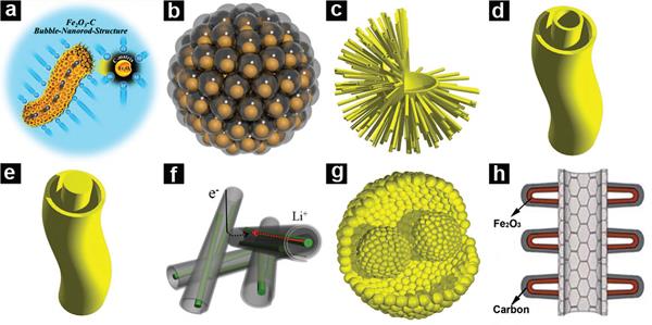 除了上述具有同心或偏心多壳层的空心结构,还有各类更为复杂的组合式中空结构,如泡内泡、管内管、管内丝结构、石榴状结构等。这些复杂的中空结构更有利于能源的储存和转换应用。如大牛崔屹发展了一种自下而上的微乳液的方法合成了硅基石榴状微球,每个微米石榴球由亚微米级大小的Si@空洞@C初级纳米粒子组成,而每个初级独立的硅纳米颗粒很好的封装在碳壳里。还有的研究者利用“定向组装”和“自我滚动”的机制构建半空心双向连续的石墨烯卷轴结构。总的来说越复杂多样的空心结构,用到的方法也是多种多样,不一而足。