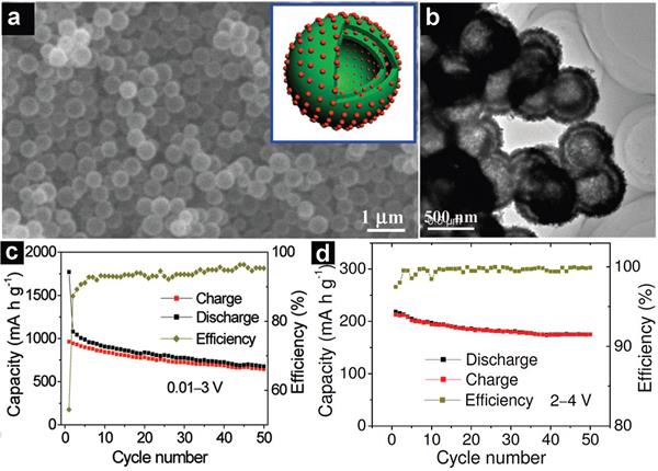 锂离子电池由于能量密度高,质量轻,无记忆效应,自放电小,环境友好等优点被广泛应用于便携式电子产品,也被认可作为即将到来的电动汽车和混合动力电动汽车选择的动力源,这些新需求也对锂离子电池的能量密度提出了新的要求。空心结构则为提高锂离子电池的比容量、循环稳定性和倍率性能提供了新的机会。空心结构一般具有高比表面积,可为锂的储存提供额外的活性位点;其空腔可提供空间调节在充放电过程中发生的应变弛豫和体积变化,从而有效减轻电极材料破坏程度,提高循环性能;空心结构薄且可渗透的外壳则可缩短锂离子和电子的扩散距离,提高倍率性能。研究者发现用合成的V2O5-SnO2双壳空心胶囊作为锂离子电池的阴极和阳极材料,可提供较高的可逆容量,表现出良好循环稳定性。