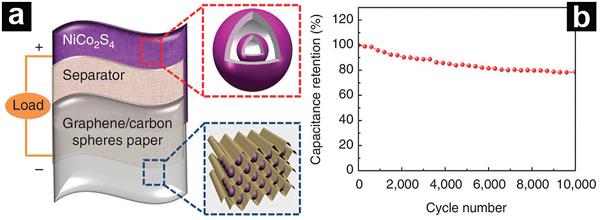 图9 NiCo2S4 /石墨/碳球纸不对称超级电容器装置的示意图及其在5 A g-1的循环性能