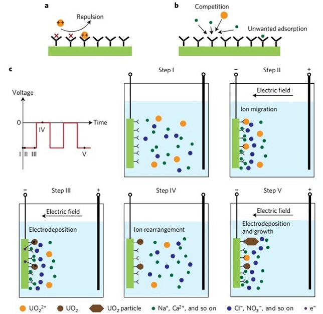 c,HW-ACE方法的物理过程,步骤1,海水中所有离子随机分布,步骤2,外电场导致离子的定向移动,形成双电层(EDL)。被吸附的铀酰离子能够特异性地结合在电极表面,步骤3,被吸附的铀酰离子能够被还原成如UO2之类的中性物种。步骤4,电场被撤掉后,没有被特异性结合的其他离子将被再次遗留在溶液里,步骤5,铀酰离子的吸附和电化学沉积继续进行,生成的UO2颗粒会不断长大。