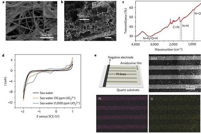 c,d,SEM照片显示了初始铀浓度为1000ppm的海水经由物理化学方法24h提取之后所用的碳-氨肟电极的形貌。