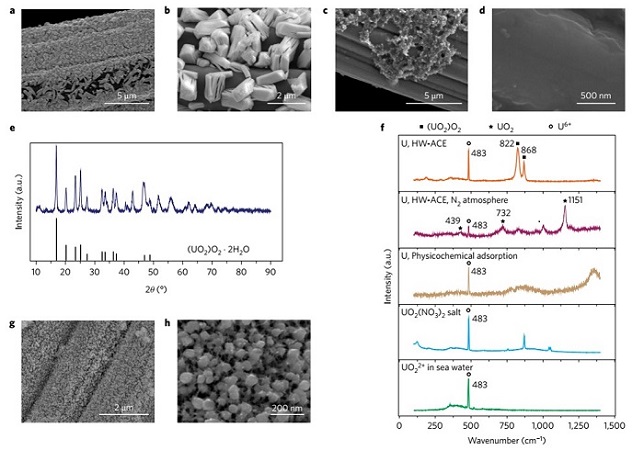 a,b SEM照片显示初始铀浓度为1000pp的海水经由HW-ACE方法24h提取之后所用碳-氨肟电极被颗粒盖满。高分辨SEM照片