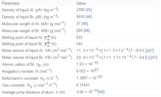 表2.熔液态Al-Bi合金中代表吉布斯自由能所对应设置的系数