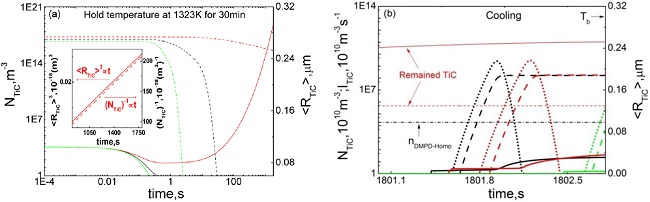 (a)第一类,不含TiC颗粒组:黑线:MPPs尺寸大小计算模拟值;圆圈:MPPs尺寸大小实验值。