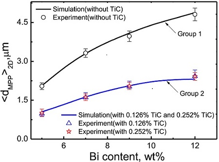 图5.MPPs在不同TiC颗粒添加量的Al-Bi合金中的尺寸大小模拟值和实验值