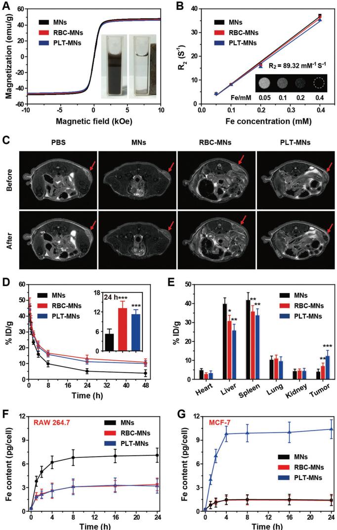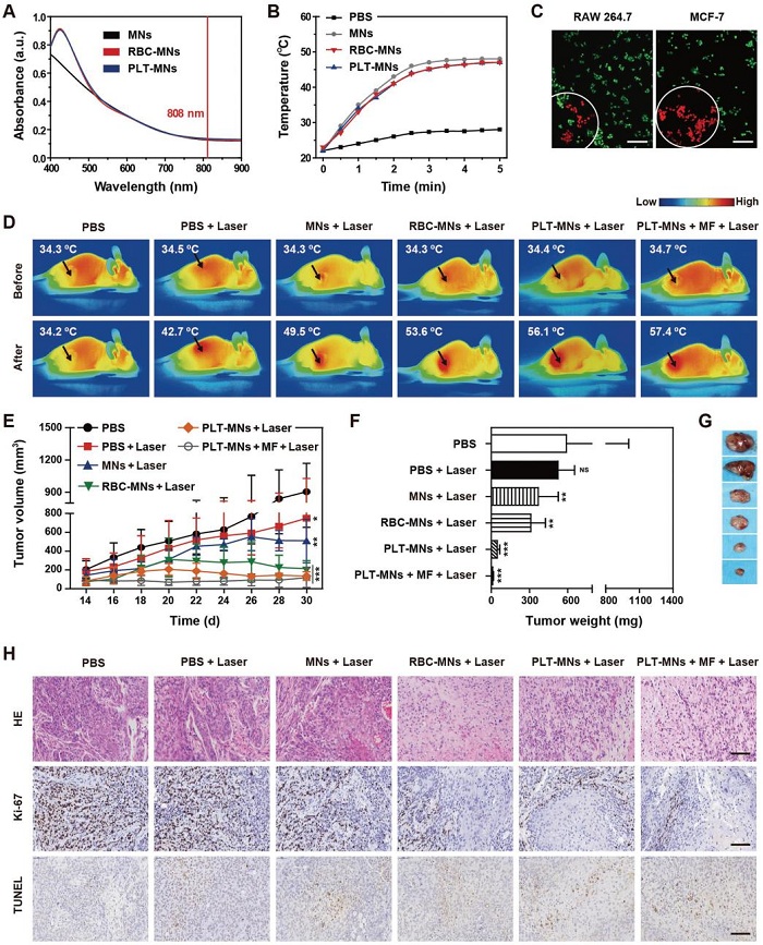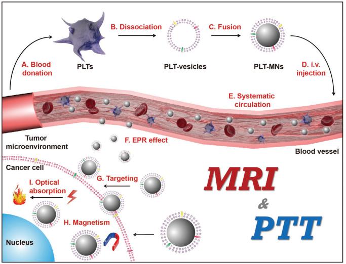 最近武汉大学的刘威、孙志军(共同通讯作者)等人制备了一种模仿血小板的纳米颗粒用于增强肿瘤的诊断和治疗效果。他们首先收集老鼠血液中的PLTs膜,并且将其覆盖在Fe3O4磁性纳米颗粒(MNs)的表面(得到的纳米颗粒称为PLT-MNs),随后将PLT-MNs重新注射到先前的老鼠体内。PLT-MNs保留了PLTs和MNs的优点:不会引起免疫反应、能够主动靶向肿瘤、MNs的核磁共振成像和光热治疗能力。另外他们发现光热治疗的位置能够吸引PLT-MNs,这可能与PLTs修复受损血管的功能有关。