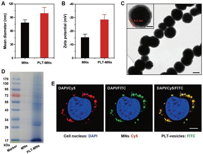 (B,C)从PLTs中得到PLTs膜形成的囊泡并且将其覆盖在纳米颗粒的表面;