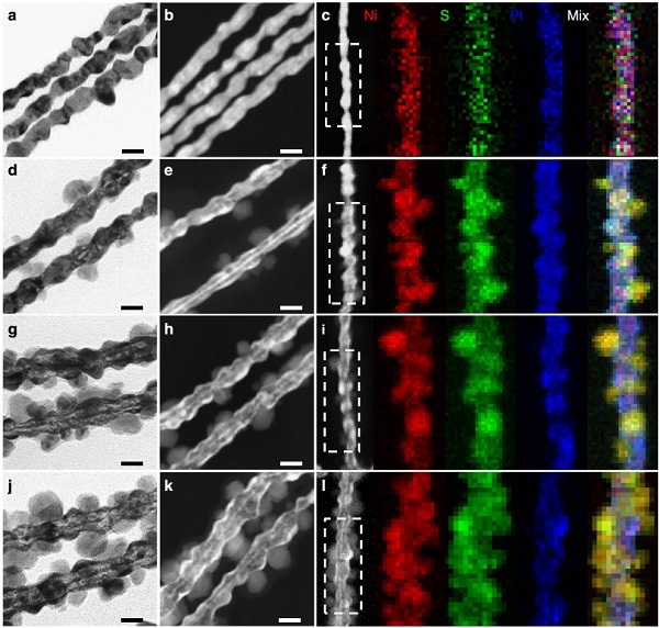 (a-c)Pt3Ni1 NWs-S,(d-f)Pt3Ni2 NWs-S,(g-i) Pt3Ni3 NWs-S,(j-l)Pt3Ni4 NWs-S。标尺尺寸,20 nm (a,b,c,e,g,h,j,k)。