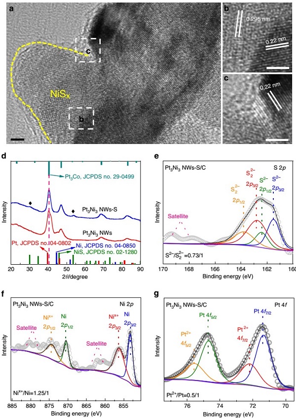 (a)Pt3Ni3 NWs-S的高分辨TEM照片,(b,c)a图中的b,c区域高倍TEM图片。黄色短线所圈区域为在Pt3Ni NWs表面的NiSx颗粒。(d)Pt3Ni3 NWs-S的XRD图。钻石标志标记的峰代表Pt3Ni3 NWs-S中产生的NiS。XPS能谱中所示Pt3Ni3 NWs-S 中S 2p (e),Ni 2p(f),Pt 4f(g)。(a)-(c)所示标尺均为2nm。