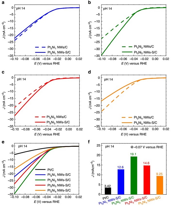 HER极化曲线(a)Pt3Ni1 NWs-S/C以及Pt3Ni1 NWs/ C(b)Pt3Ni2 NWs-S/C和Pt3Ni2 NWs/C(c)Pt3Ni3 NWs-S/C和Pt3Ni3 NWs/C(d)Pt3Ni4 NWs-S/C和Pt3Ni4 NWs/C(e)Pt-Ni NWs-S/C和Pt/C 在室温条件,pH=14时的HER极化曲线(f)相对于图(e)-0.07V的电流密度直方图。所有的极化曲线都以10mVs-1的扫速,1600r.p.m.的转速,无孤立绝缘电阻补偿记录。电流密度均标准化为工作电极的几何面积大小代表。