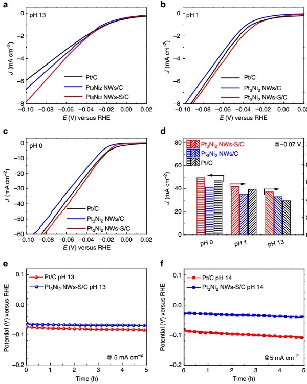 Pt3Ni2 NWs/C,Pt3Ni2 NWs-S/C以及Pt/C在室温条件,pH为13(a),1(b),0(c)的HER极化曲线。(d)相对于(a)-(c)的可逆氢电极为-0.07V偏差下的电流密度比较直方图。所有的极化曲线都以10mVs-1的扫速,1600r.p.m.的转速,无孤立绝缘电阻补偿记录。电流密度均标准化为工作电极的几何面积大小代表。Pt3Ni2 NWs-S/C以及Pt/C以5mAcm-2的电流密度,在pH为13(e),14(f)以及室温条件下的计时电位分析