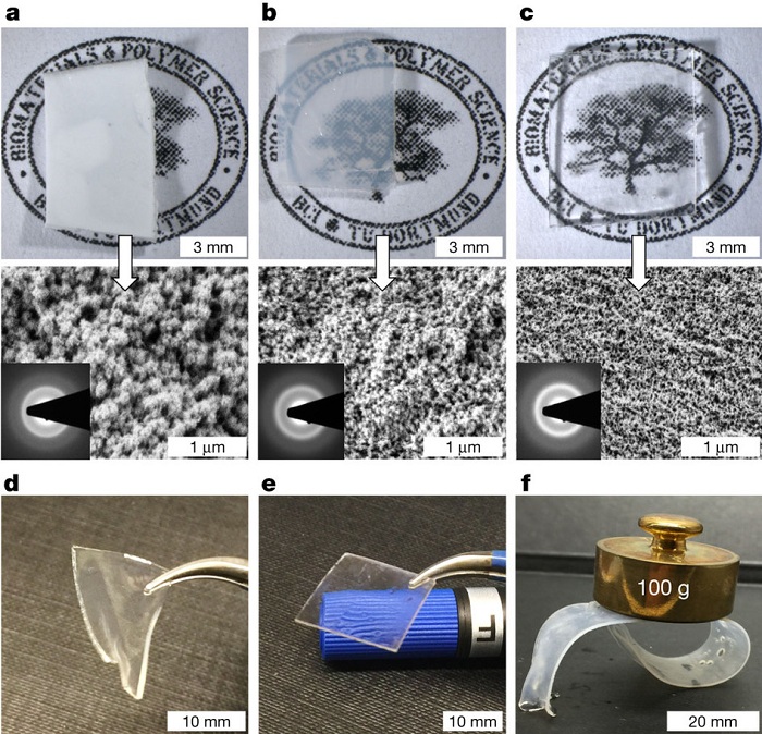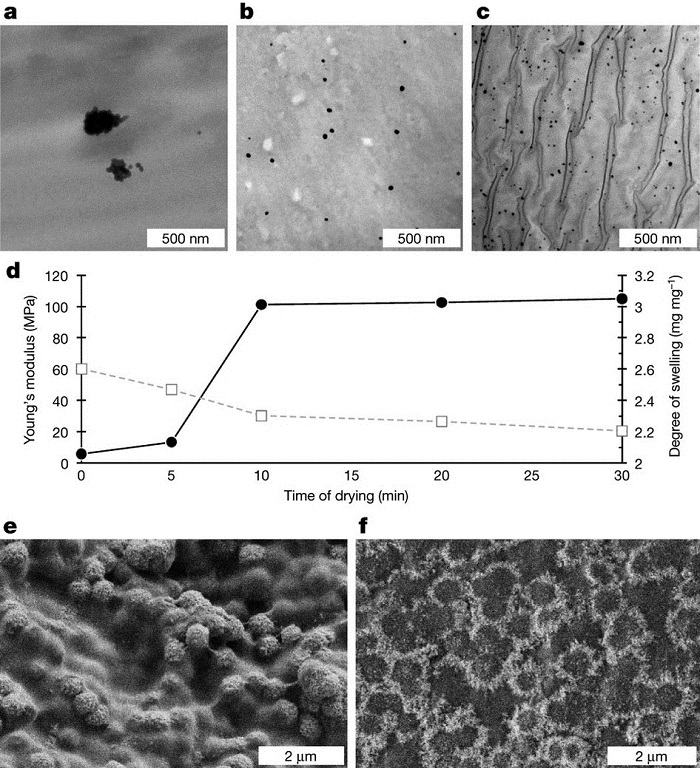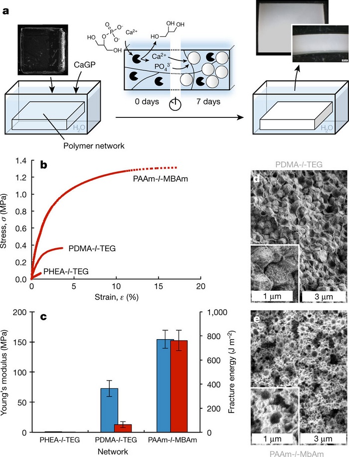 近日,德国多特蒙德工业大学的Joerg C. Tiller1(通讯作者)等人通过酶引发在聚合物水凝胶中形成了均匀分散的无定型磷酸钙纳米结构。该水凝胶在溶胀平衡时的断裂能可达到1300J/m2,高于目前所知的任何一种合成水凝胶。其弹性模量达到了440MPa,远远高于软骨和皮肤。另外,这种高充填复合材料可以被设计成透明的且保持其原有的延展性,即使是有缺口存在的条件下仍能保持较高延展性。该研究团队发现透析可以调控该均匀矿化水凝胶的机械性能,尤其是硬度。该成果以“Enzymatic mineralization generates ultrastiff and tough hydrogels with tunable mechanics”为题于2017年3月1日发表在期刊Nature上。