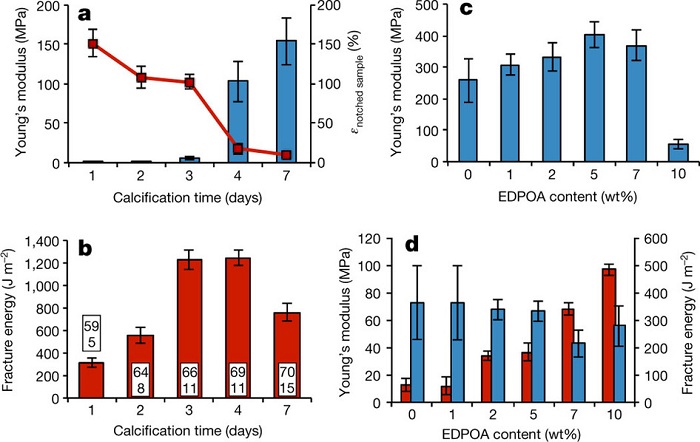 d)含EDPOA的PDMA-l-TEG复合物的断裂能(红色)和杨氏模量(蓝色),钙化时间:0wt%和7wt% EDPOA为4天,1wt%,2wt%和5wt%EDPOA为3天,10wt%EDPOA为7天。这些实验至少有三个平行样,所有数据都是平均值,误差线代表标准偏差。