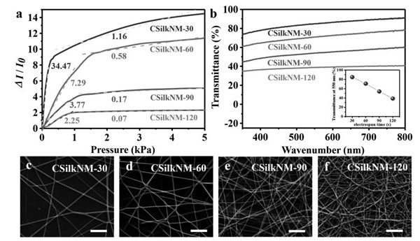 图3. CsilkNM压力传感器的灵敏性和透明度以及CsilkNM的各种形态