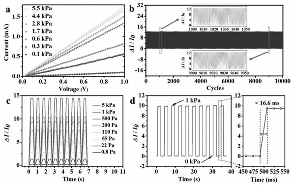 (b)压力传感器在2.5 kPa压力下的以0.5Hz频率下经过超过10000次循环装卸后的稳定性测试,插图表示在分别经过1000和9000次循环后在进行50次循环测试的结果
