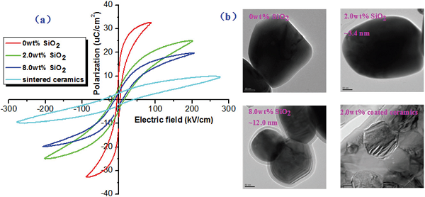 图5 钛酸钡和二氧化硅的复合材料的极化强度和电场强度的关系示意图及其透射电镜图像