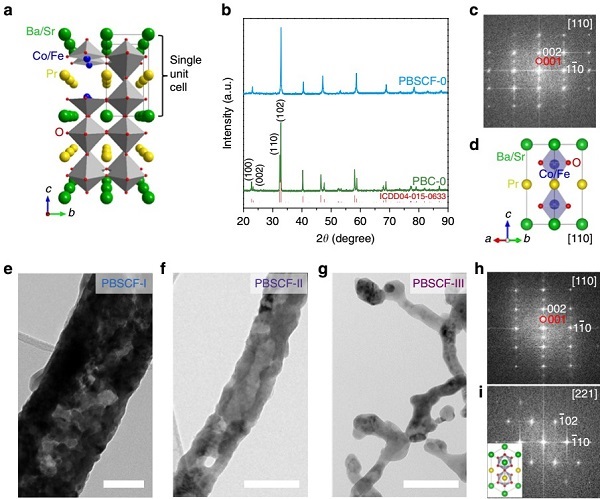 (a)PrBaCo2O5 +δ(PBC)/PrBa0.5Sr0.5Co1.5Fe0.5O5 +δ(PBSCF)双钙钛矿晶体结构.(b)PBC-0和PBSCF-0的XRD谱图。(c)快速傅里叶(FFT)模式,所选区域大约为23nm×23nm(d)相应的PBSCF单晶胞的结构示意图。(e-g)亮区域的TEM图像(e)PBSCF-Ⅰ(f)PBSCF-Ⅱ(g)PBSCF-Ⅲ(h,i)快速傅里叶模式(分别从区域19nm×19nm和15nm×15nm获得)Ⅰ中插入的为PBSCF沿着[221]区域方向所示的单晶胞结构图。红色圈代表由于双钙钛矿结构导致的超级晶面反射。标尺长度,100 nm(e-g)。