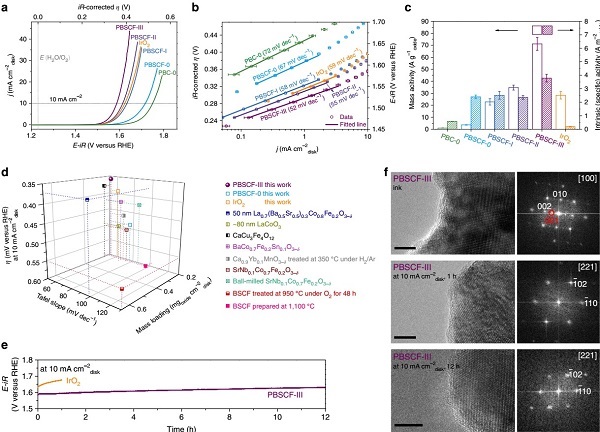 (d)在0.1M KOH电解液中,10mAcm-2的圆盘电极上所获得OER反应活性比较,文中的PBSCF-0, III 和 IrO2的Tafel斜率和催化剂质量负载与最近报道的具有新组分,纳米结构以及空气中处理过表面的新型钙钛矿催化剂进行比较;所有来自文献的过电位η都进行过IR矫正。Ca0.9Yb0.1MnO3–δ缺乏质量负载记录,被假定为图中数量最小;BSCF代表Ba0.5Sr0.5Co0.8Fe0.2O3-δ;IR矫正对于不同测试器件结果的相对比较非常重要(补充材料图13,补充材料表格3,补充材料标准6)。