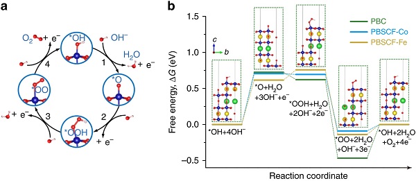 (c)PBC(Co)和PBSCF(Co/Fe)的B位被认为是催化活性中心,所有吸附物都键合在这些还原中心上,吸附物嵌入到PBC片层的原子结构上。在所有的流程图中,每个深蓝色球都是Co或者Fe原子,荧光黄色的秋是Pr, 绿色的球是Ba或者Sr,红色球是O,浅粉色的球是H。