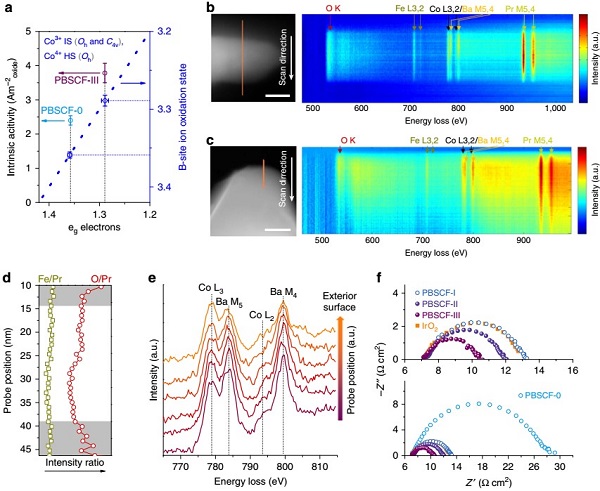 (d)纤维上O/Pr和Fe/Pr强度比例(灰色所示为明显含有不同O/Pr比例的纳米纤维表面)。(e)从PBSCF-III 特定表面区域获得的Co L2,3 和Ba M4,5离子化边缘的EELS能谱。(f)PBSCF-0, I,II, III和IrO2催化剂在0.1M KOH溶液里,1600 r.p.m转速下在1.68V(相对可逆氢电极)下的电化学阻抗谱图。