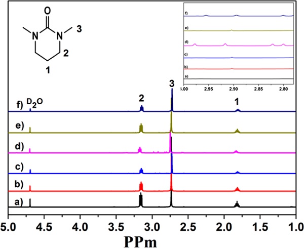 a)原始的DMPU, b)全放电之后的LiTFSI/DMPU, c) 第一圈循环之后的 LiTFSI/DMPU, d) 循环10圈之后的LiTFSI/DMPU, e) 全放电之后的 LiTFSI/DMPU/BHT, f) 个循环20圈之后的LiTFSI/DMPU/BHT。