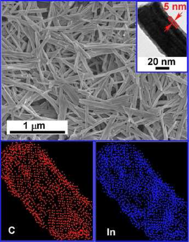 C-In2O3纳米带材料的SEM图像,内嵌图为TEM表征图像;