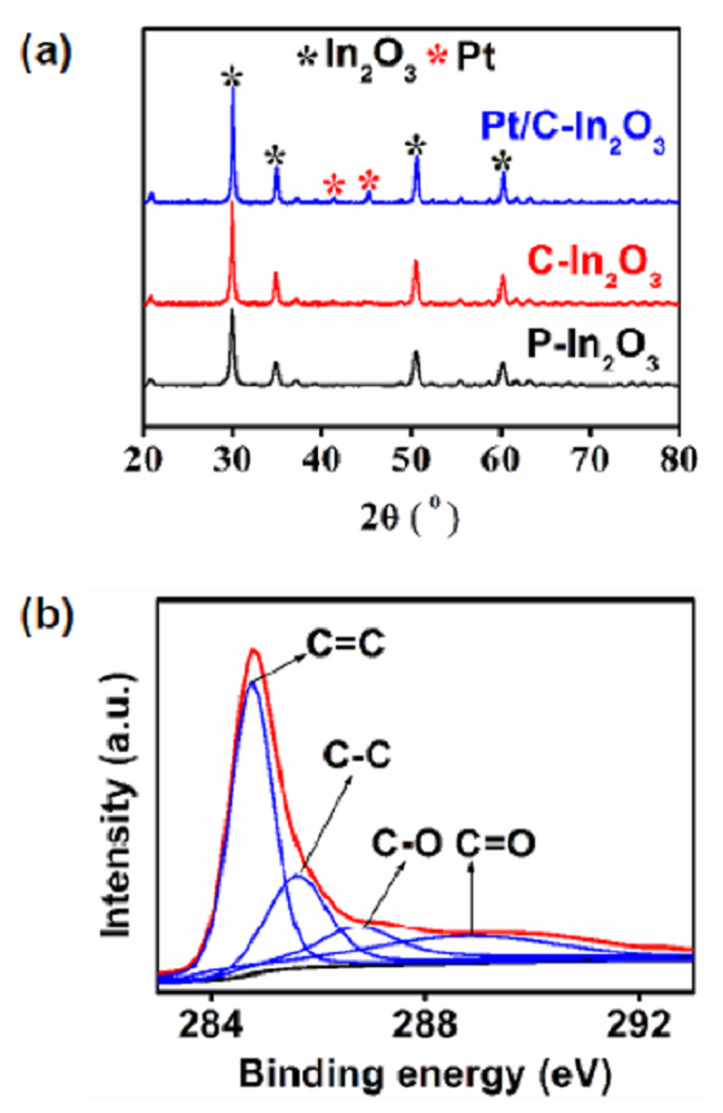 (a) P-In2O3 (pure In2O3 ), C-In2O3和Pt/C-In2O3的XRD图;