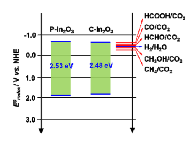 水作为CO2还原中常见的还原剂,通过光催化生成的质子很容易两两结合生成H2,因此降低了CO2还原反应的效率。氧化铟由于其优异的光化学稳定性、较强的产物选择性(CO2 → CO2–)以及匹配的还原电势(-0.62 V vs. NHE, pH=7),是一类比较理想光催化剂,但其在CO2还原反应中,易于催化水生成H2,而不是碳氢化物。因此,如何设计和制备氧化铟基光催化剂,有利于CO2还原生成碳氢燃料依旧是一个有待攻克的研究方向。