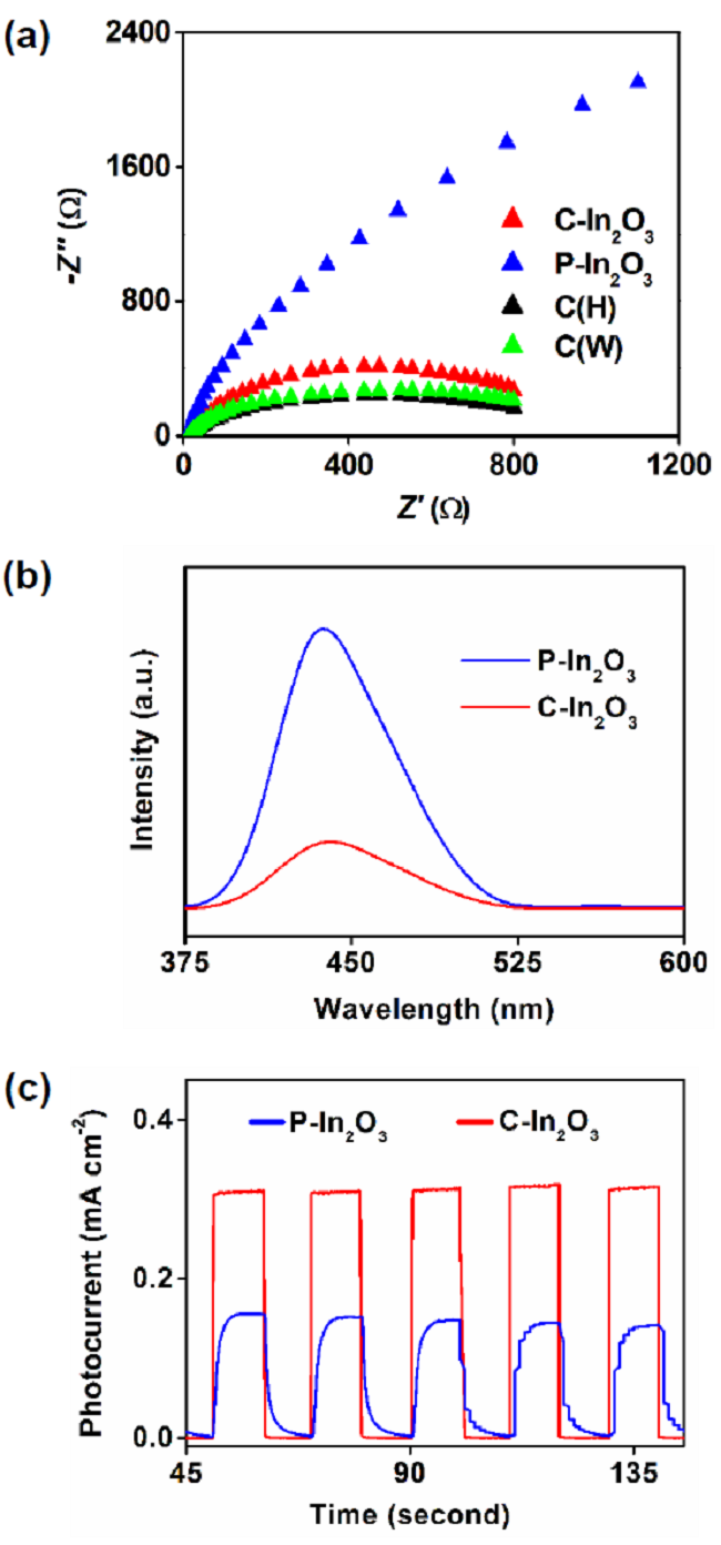 (c) In2O3和C-In2O3的光电流vs.时间曲线;