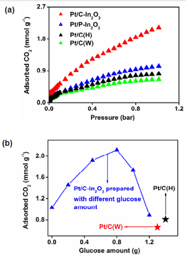 (a) 不同材料的CO2吸附容量vs.气压曲线:Pt/C-In2O3、Pt/-PIn2O3、Pt/C(H)和Pt/C(W);
