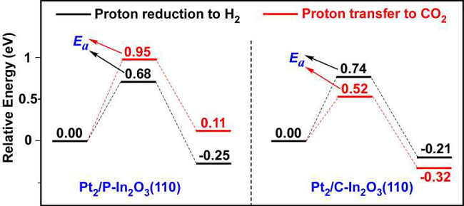 DFT模拟计算所得的能量分布图:左图为质子还原生成H2 (Pt2/P-In2O3(110)),右图为质子转移到CO2中的一个O原子上(Pt2/C-In2O3(110));
