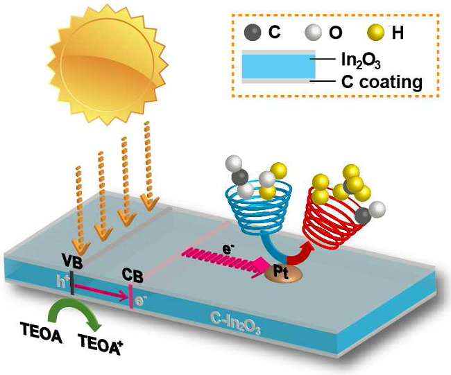 以TEOA为牺牲剂(电子给体),CO2在Pt/C-In2O3上催化还原的示意图。