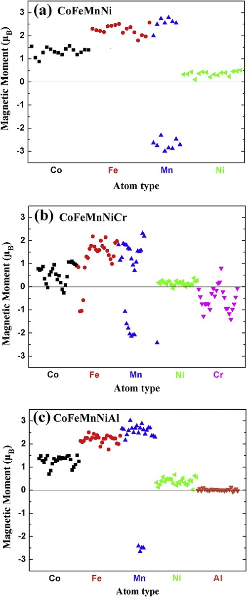 图5. CoFeMnNiX (X = Al, Cr, Ga, Sn)系列合金在0℃局域单原子磁矩的预测
