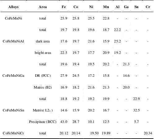 表1.CoFeMnNiX (X= Al, Cr, Ga, Sn)高熵合金通过SEM-EDS测量得到的化学成分(原子百分比)
