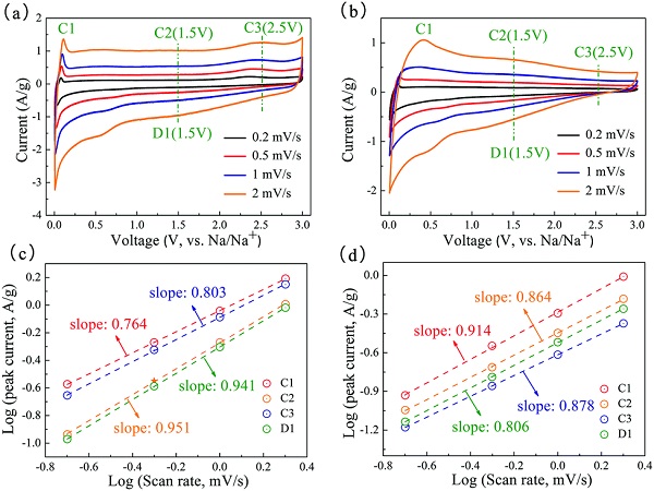 石墨烯负极在不同扫速下的循环伏安曲线(a)醚类电解液体系(b)酯类电解液体系