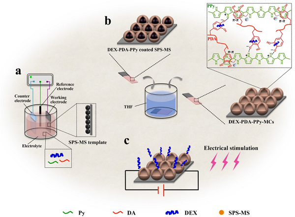 近日,西南交通大学鲁雄教授团队研发了一种基于仿贻贝机理的刺激响应性导电微囊。该导电高分子微囊结合导电聚合物分子聚吡咯(PPy)的氧化-还原性和仿贻贝分子聚多巴胺(PDA)的粘附性, 利用聚苯乙烯微球为模板,通过精确调控电化学沉积条件制备得到。在电沉积氧化过程中,药物和聚多巴胺作为阴离子被掺杂到聚吡咯主链中。当在还原条件(电刺激)下,药物就会被释放出来。因此,其具有电调控刺激响应药物释放和电调控细胞行为的双功能,可为电治疗提供双重刺激,物理刺激和化学刺激,从而增强单一电刺激疗效。物理刺激是利用聚吡咯的导电性传输电信号给细胞,利用生物电调控细胞行为;化学刺激是指利用聚吡咯的氧化-还原特性,在电刺激下定时、定量的按需释放药物,促进细胞分化。物理信号和化学信号协同提高电治疗疗效。相关成果以“Electroresponsive and cell-affinitive polydopamine/ polypyrrole composite microcapsules with a dual-function of on-demand drug delivery and cell stimulation for electrical therapy”为题发表在2017年3月10日出版的Nature子刊NPG Asia Materials上。该研究得到了国家重点研发计划、863、国家自然科学基金等项目支持。
