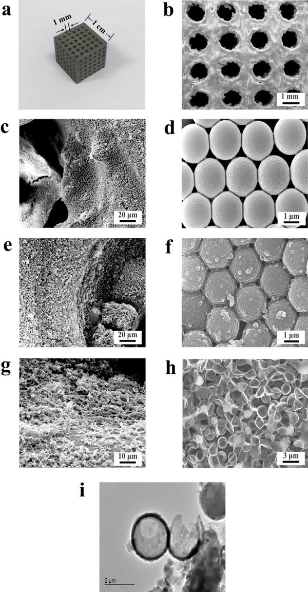 (g)和(f)去除聚苯乙烯后PDA-PPy微囊的SEM图片。(i) PDA-PPy微囊的TEM图片