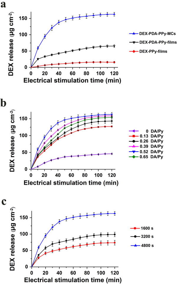 (c)不同DA/Py摩尔比的PDA-PPy微囊在相同电刺激下药物累积释放曲线