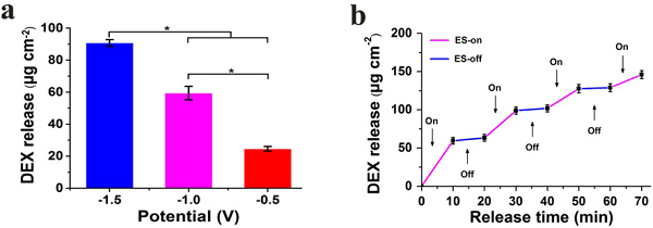 (a)PDA-PPy微囊在不同电压下刺激10 min后药物释放量