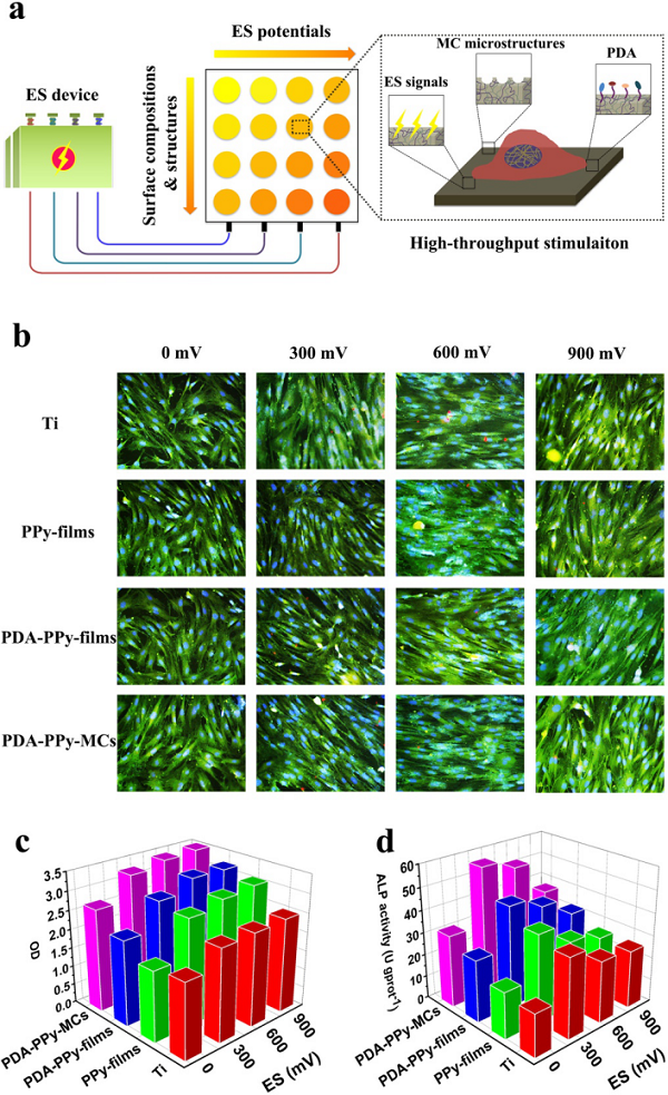 (a)高通量电刺激系统示意图。通过高通量电刺激观察细胞在不同表面结构、组分和电信号下的生长情况