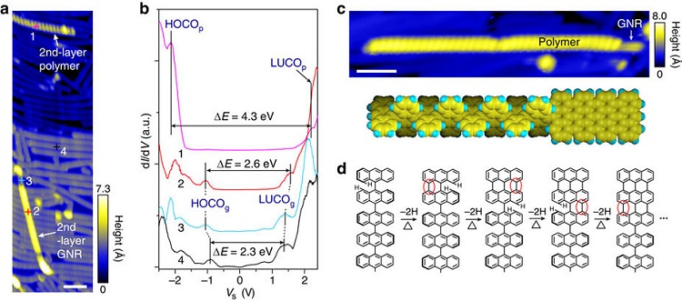 (c) STM图像显示GNRs尾部与聚合物链有带内异质结(Vs = -2 V, It = 100 pA),正如示意图所示,标尺 5 nm。
