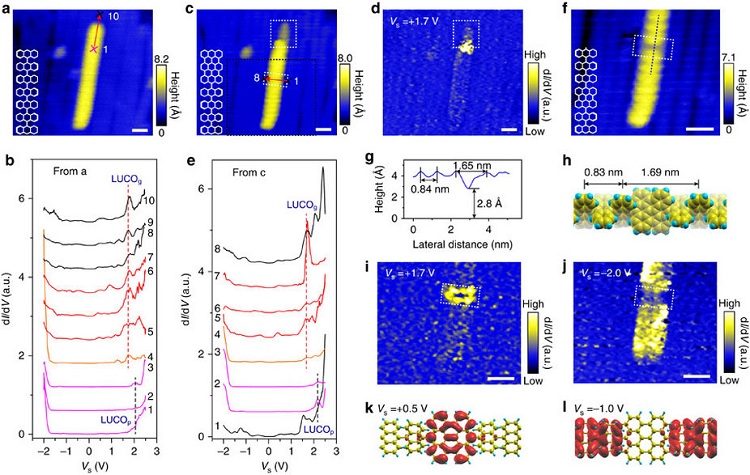 (k)和(l) 在Vs=+0.5 V (k) 和Vs=-1 V (l)时,GNRs带内异质结的电荷分布。图中所有标尺为2 nm。
