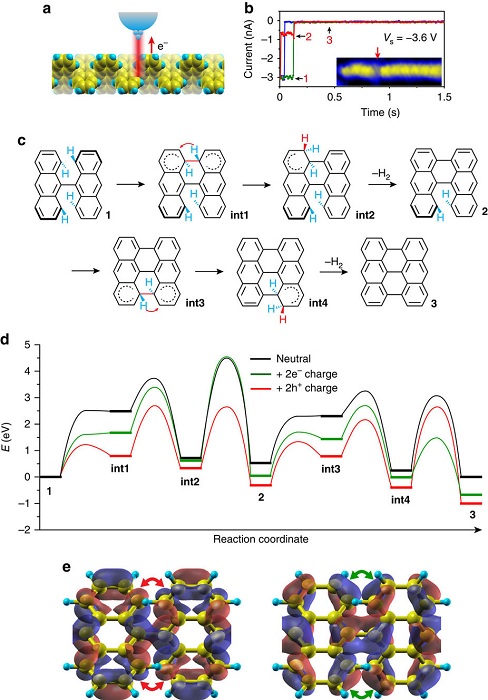 本文作者利用STM探针实现了自下而上制备GNRs新方法,这一制备过程可通过调节探针输出电荷的数量与电性进行控制。利用第一性原理计算与实验验证,作者发现利用STM探针空穴注入可以使得准自由态的聚合物(金属基底的催化作用被消除)发生环化脱氢的类多米诺效应。这一反应过程符合伍德沃德 – 霍夫曼规则:当空穴注入时是C-C键的形成是对称允许的,当电子注入时是对称禁阻的。金属基催化作用被消除后,STM探针仍可使聚合物前驱体在任意位点石墨化。这是可控的,自下而上的制备GNRs和异质结的新方法。