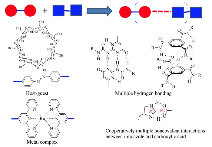 超分子聚合物通常是通过A-A,B-B的双官能团分子体系构建的,通过A和B之间的非共价相互作用如氢键、配位以及多种非共价相互作用的协同以形成超分子聚合物。其中多重氢键、主客体相互作用、极性分子的配位相互作用易使超分子聚合物形成凝胶结构。