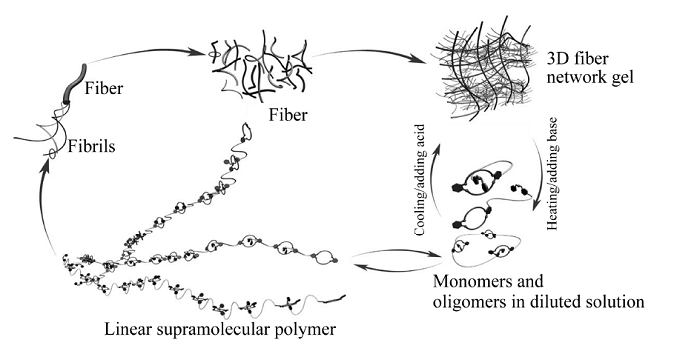 超分子聚合物是基于非共价相互作用和自组装形成的聚合物体系。超分子聚合物凝胶是一种非常重要的软物质材料,它代表了一个全新的概念和更复杂的凝胶体系。这种新型的超分子体系的构建,是基于多种非共价相互作用协同的多层次组装。即小分子构筑基元首先组装成为超分子聚合物,而这些非共价聚合物的多层次组装形成凝胶的纳米结构。