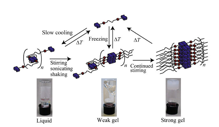 对于超分子自组装而言,氢键作用可以说是最重要的非共价相互作用。这不仅仅是体现在超分子科学的研究方面,自然界和生命体系中各种各样的自组装纳米结构更是证明了氢键作用的重要性。基于氢键体系的超分子聚合物凝胶也是非常重要的。聚合物的多层次组装可以导致凝胶的形成。其中,多层次、多方位的氢键作用都发挥了重要作用。而某些氢键作用的形成是基于动力学控制,形成了不太稳定的自组装体系。机械搅拌则可以破坏不太稳定的体系,促进了稳定的基于热力学控制的超分子聚合物凝胶的形成。对于构建超分子聚合物凝胶来说,不仅仅是一般意义上的氢键作用,某些特殊的氢键作用也